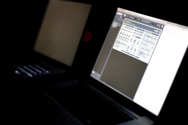 Die technische Seite, die vor allem mein Bereich war, beruht auf drei Teilen. Das Pendel, das über einer Kinect-Kamera verfolgt wurde, wurde in Processing ausgelesen. Die ausgewerteten Koordinaten und Werte wurden dann an Max 6 übergeben, eine grafische Programmierumgebung, die in der Verarbeitung von Musik seine Stärken hat. Von dort wurde dann ein Synthesizerprogramm gesteuert, das den Sound generierte. Die visuelle Verarbeitung geschah bereits in Processing. Dort veränderte das Pendel die Geschwindigkeiten und Größen eines Partikelsystems, das über einen Beamer an die Wand projiziert wurde.