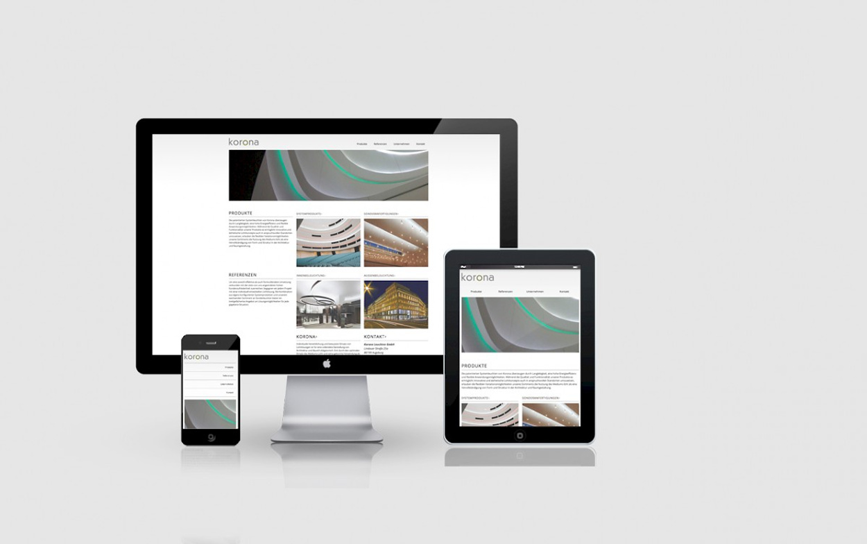 Das Redesign der Webseite der Korona Leuchten GmbH entstand als Abschlussprojekt zusammen mit Anna-Sophie Meyer. Korona ist eine kleine Augsburger Firma, die sich im Leuchtenbau spezialisiert hat. Ihr Kerngeschäft betreiben sie mit einem sehr modularem LED-System, das sich den Bedingungen der einzelnen Anwendungszwecke genau anpassen lässt. Dabei übernimmt die Firma nicht nur die Produktion und den Vertrieb, sondern ist Ansprechpartner bei der Konfiguration, betreut das Projekt und ist oft auch an der finalen Montage beteiligt.