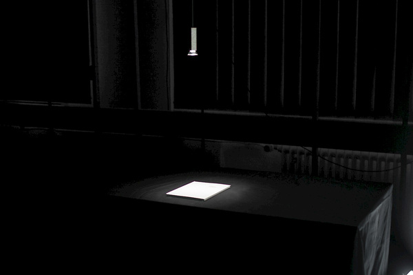 Für die Bachelorausstellung an meiner Hochschule hatte ich die Idee, die im Film verwendeten Interfacelayer als Präsentationsform aufzugreifen. Um den Effekt der schwebenden Layer zu simulieren verwendete ich frei im Raum hängende Plexiglasplatten, die von einem Beamer über Rückprojektion angestrahlt wurden. Erst beim Aufbau viel auf, dass der Beamer, trotz schwarzem Hintergrund, die Betrachter blendet. Dies wurde durch eine Blende zwischen Plexiglas und Beamer gelöst.